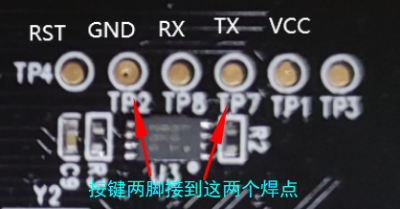 1、增加按键功能,短按切换当前模式界面风格,双击切换字体,长按切换模式(时钟,日历,图片),需要将按键两个脚接到TP2(GND)和TP7(TX)。
