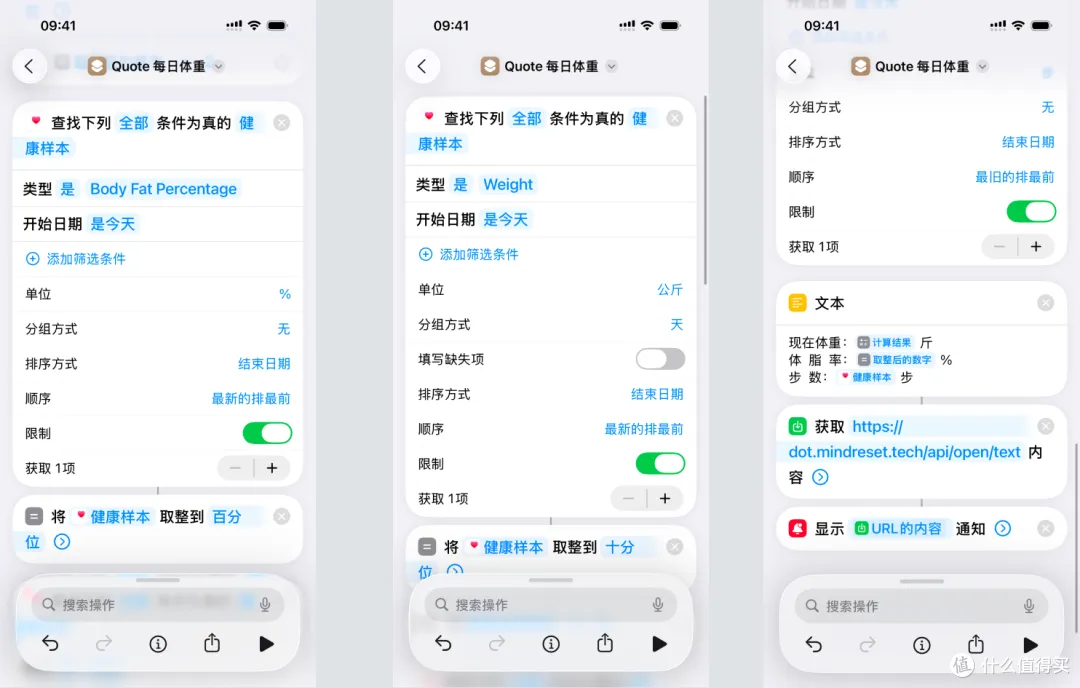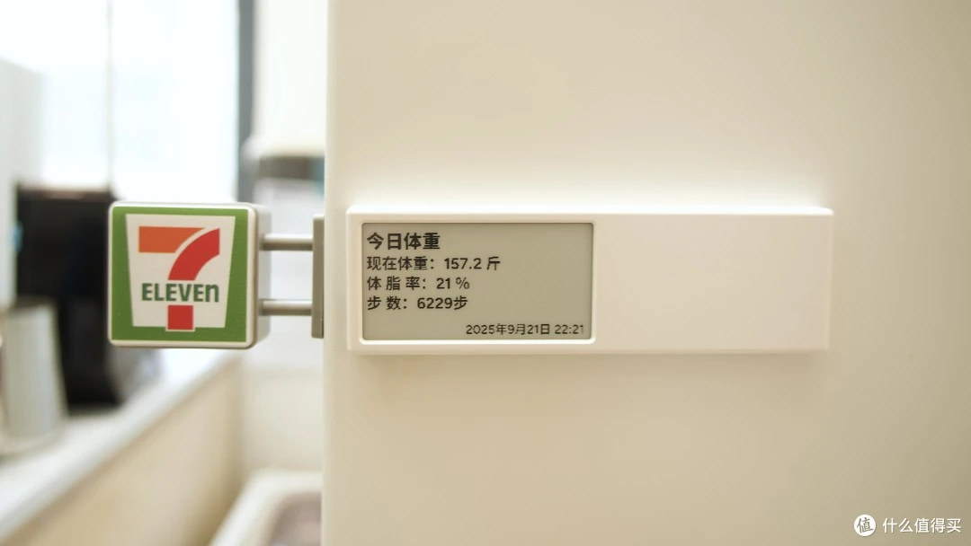 这就是我结合苹果的快捷指令打造的一个健康提醒器。每天早晨,体重秤的数据会自动同步到“健康”App。我设定了一个自动化指令,它会定时抓取我的体重、体脂率和步数,然后通过API接口,将这些信息整理好并推送到我的 Quote/0 上。而这个 Quote/0 我把它吸附在了冰箱上,每当要喝饮料的时候,我都要掂量掂量。