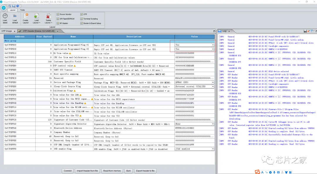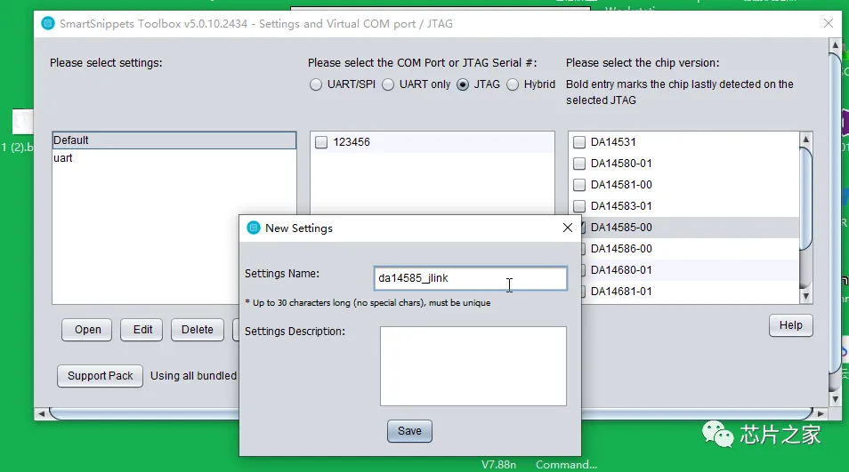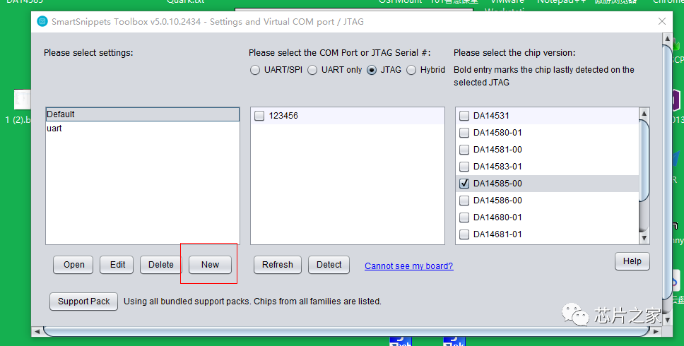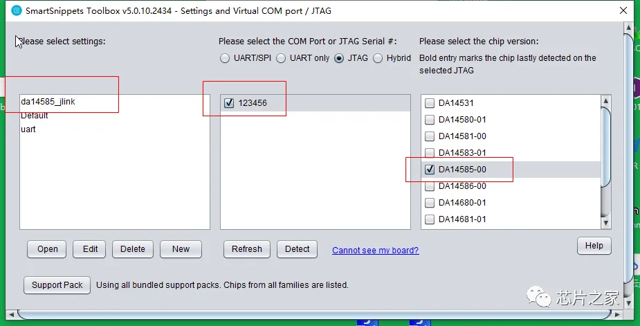 勾选下JTAG的那个ID 123456和芯片DA14585-00,然后点击OPEN