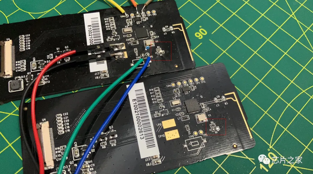 先看下板子对比图,一个是我没焊接灯的,一个是我焊接了灯的,那边我加了个600欧的R4, LED用了0603的以前的料子焊接到D1,上板子是我焊好的,下面图是原来的没有焊R4和D1的对比。