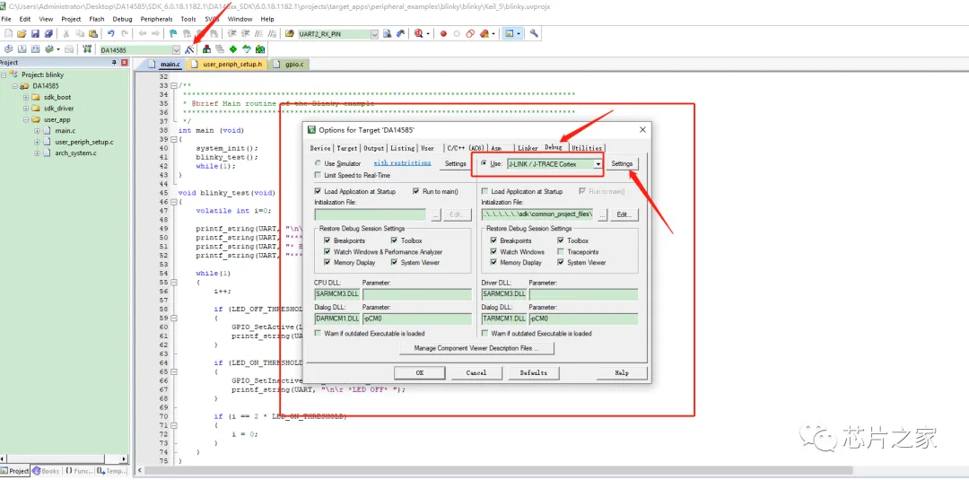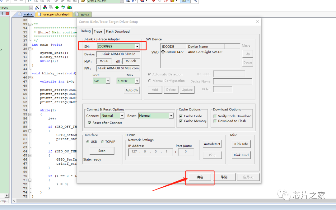 然后我们进行DEBUG看看,灯闪不闪,先进行JLINK设置