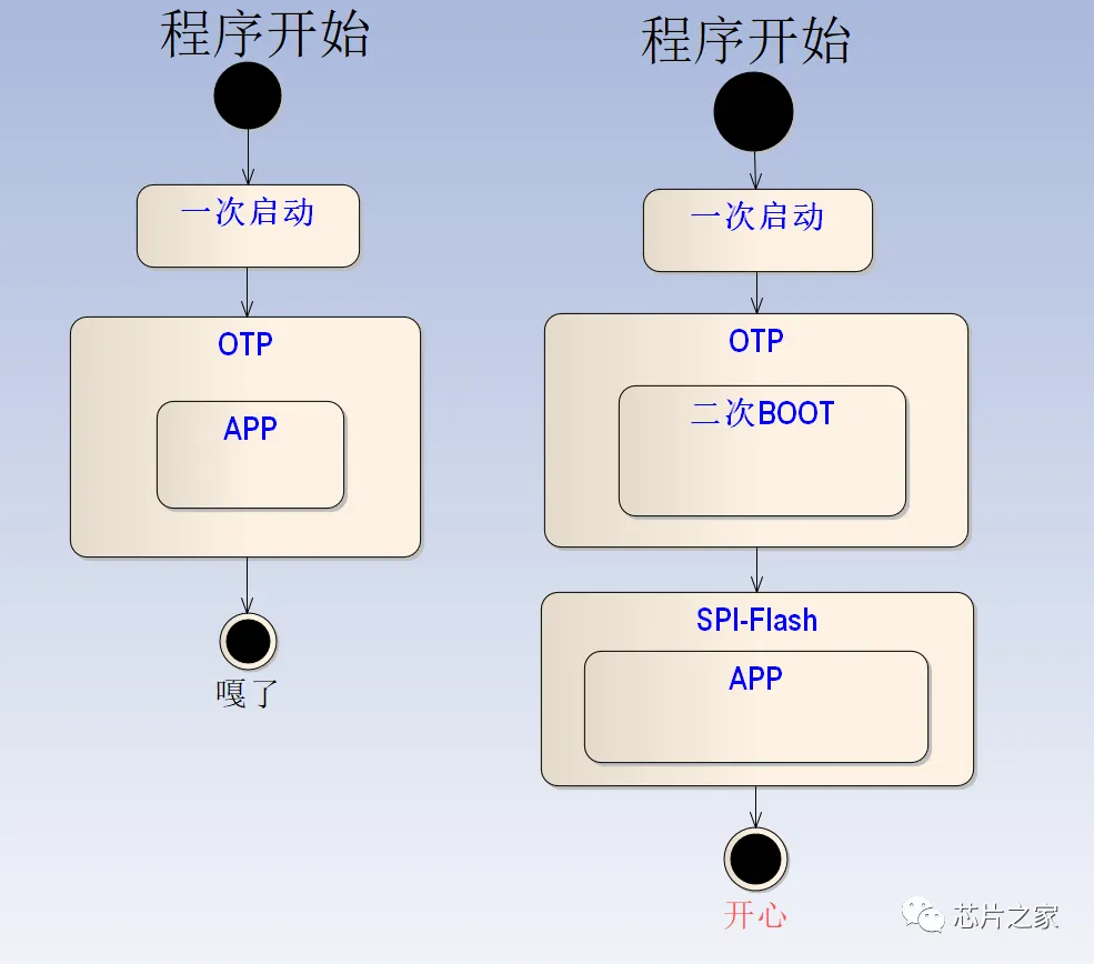其实OTP这部分,得看厂家的人品了,OTP的意思是一次性的写入,写后就不能更改了,所以英文翻译过来是一次编程one time program,但是这么好的芯片不至于设计成这样吧?所以DA14585这里有提供了一个小技巧(二次启动);就是如果你不想让别人再用的话,就把程序编写好后生成二进制直接写入OTP,也就是在OTP里面写你自己的APP,启动的时候(一次启动)就直接加载启动到OTP里了;但是如果你想再次使用做开发的话,就不能直接把APP写在OTP里了,那怎么办?那就在OTP里面烧个二次启动BOOT的程序呀,这个二次BOOT结合外部SPI-Flash进行启动,程序APP可以烧到外部SPI-Flash里(所以可以多次刷写APP到SPI里),但是二次启动的BOOT已经固化到OTP里了;也就是说,OTP里面如果烧录的是二次BOOT的话,那就可以多次利用了,那这个芯片你就继续可以玩,不怕被OTP的限制无法使用。所以捡漏OTP的大致流程是(右边的流程才捡漏哈):