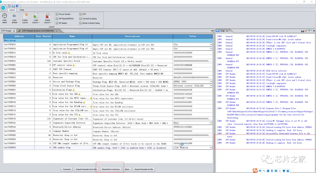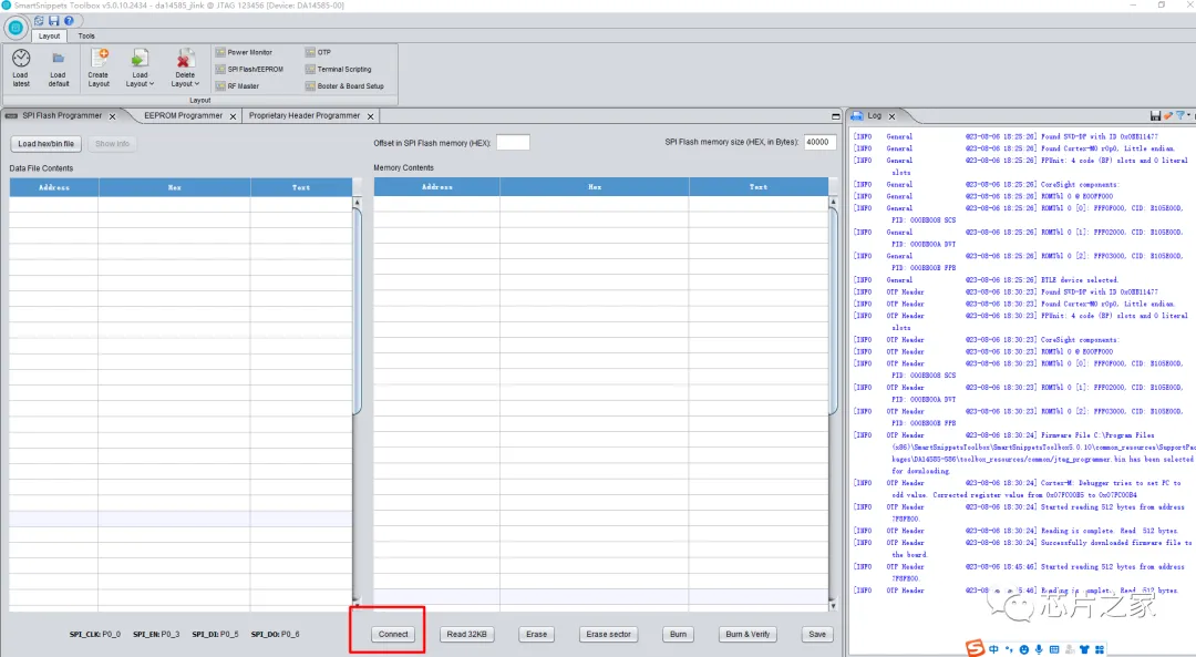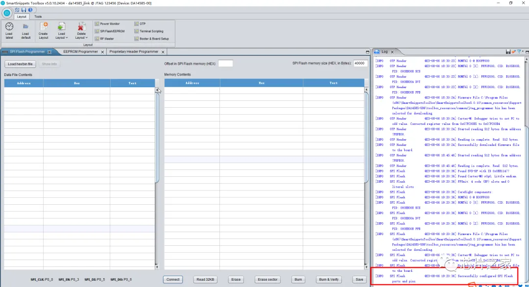 所以对OTP的理解,其实就是取决于买到的芯片里面的OTP装了啥程序,如果是二次BOOT的程序你就开心了,如果是正常的APP程序,你就买嘎了。然而二次BOOT程序厂家一般也都是直接去DA官方下SDK编或者直接有官方编好的HEX的文件拿来用了,基本上都是官方标准的代码,所以大家也可以去下载瑞萨的DA14585X的SDK看,里面有二次BOOT的代码。所以,怎么说呢,如何判断OTP里面是不是写了二次BOOT还是APP,这个本人也暂时无法识别,有知道的老哥哥们教我下,感谢!然后我们继续,既然流程图上是说OTP如果被刷入二次BOOT的话SPI-FLASH应该刷的是APP,所以我们写个APP,烧到SPI-FLASH看看不就可以了?OK,开始前,我们先看看SPI-FLASH是否可以读取,点击红色框,进入SPI-FLASH界面