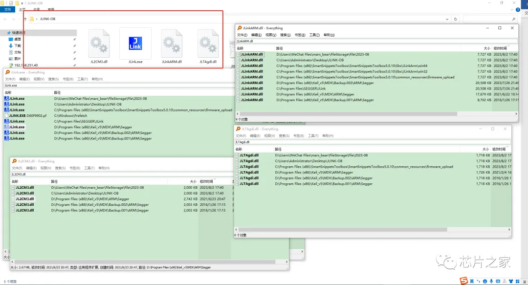 安装好 Keil和smartsnippets_toolbox后,需要把商家给的JLINK-OB的PJ工具给复制到对应的目录;商家会给你几个文件替换破解,然后我们用everything大法来找到这几个文件替换,只要替换SmartSnippets Toolbox v5.0.10和KEIL的安装目录下的就可以了,路径下面图: