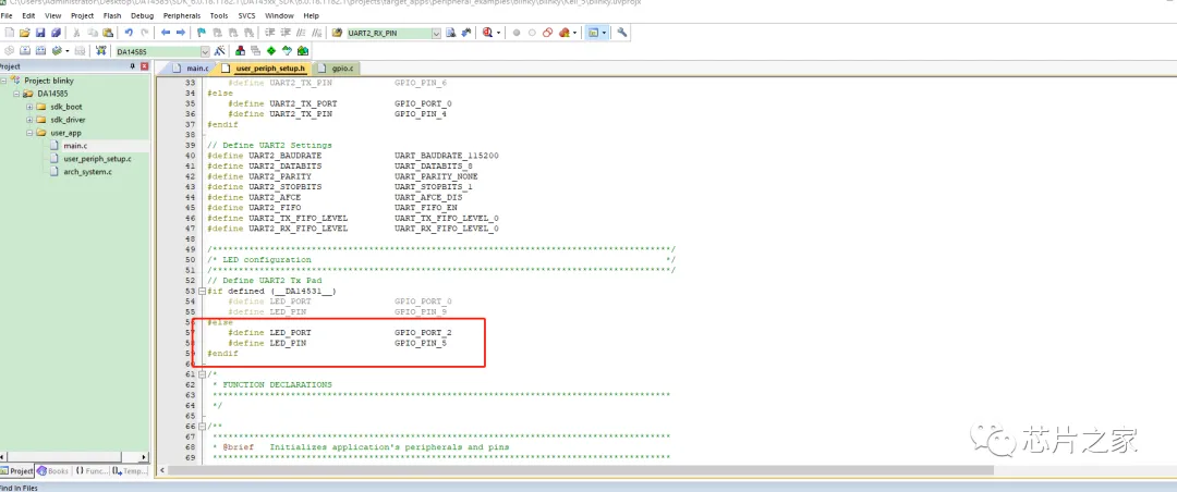 这里我们要修改一下了,因为要闪灯,所以引脚要对得上,先看看代码里面的 LED_PORT和 LED_PIN是多少。
