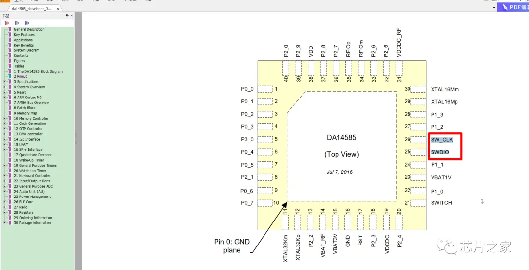 哇塞,是瑞萨的DA14585耶,这款芯片是很流行BLE蓝牙,小米手环也用这个来做主控,其他大厂也都用,所以资料上应该还可以,先去下载了下他的数据手册,打开手册看看: