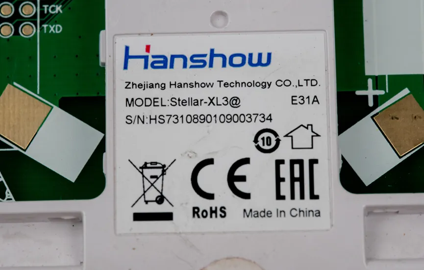 这个墨水屏价签的型号:Stellar-XL3,后面还有一个E31A。底下还有唯一的S/N码。