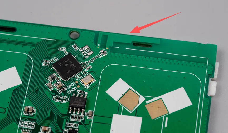 PCB板载蓝牙倒F天线特写。天线滤波电路旁边看起来有一颗32768的晶振没有焊接。做时钟日历需要把这个晶振和起振电容焊接上去。