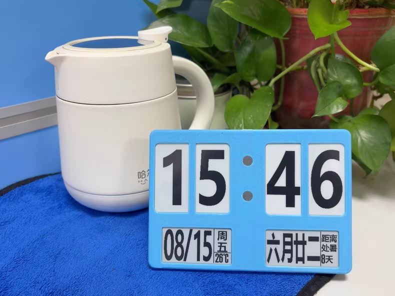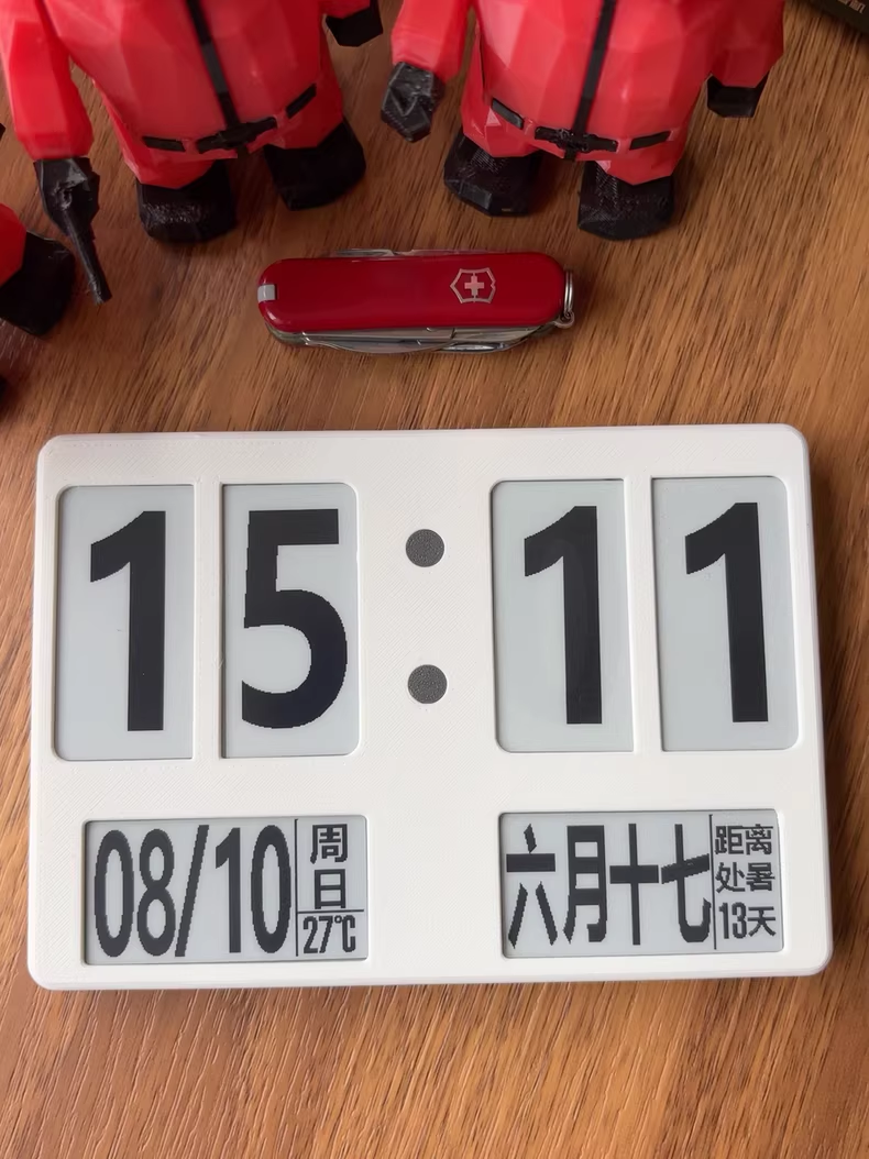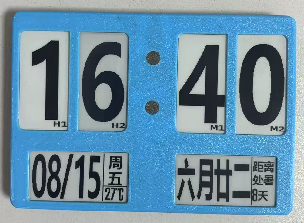 六连屏时钟日历是一款超酷超清晰墨水屏时钟万年历,相对2.13的手把件来说,是一款超大号桌面摆件,能同时显示日期时间温度农历。整体由六块2.13寸墨水屏组装而成,高度 10 厘米,宽度 14 厘米,厚度 1.3 厘米左右。