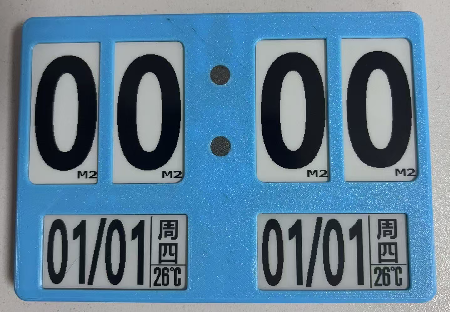 此时需要通过小程序连接各小屏幕进行设置,上面四块是时钟数字,屏幕右下角的M2角标是被复位成默认的分钟个位了,需要通过小程序修改,逐个连接上屏幕后,点击小程序中的“时间模式”切换成对应的标志,下面为已经调好的状态,从左到右排列分别为 H1 - H2 - M1 - M2。