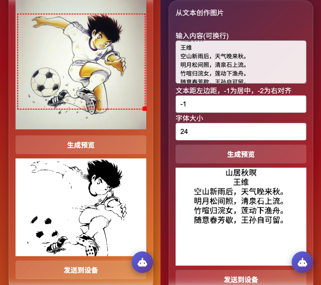 3、客户端的使用者,会打开一个网页(也可以叫单页应用),在这个网页上可以通过局域网连接墨水屏系统,输入文字生成图片并投屏,或者上传图片进行合适截取后并投屏。