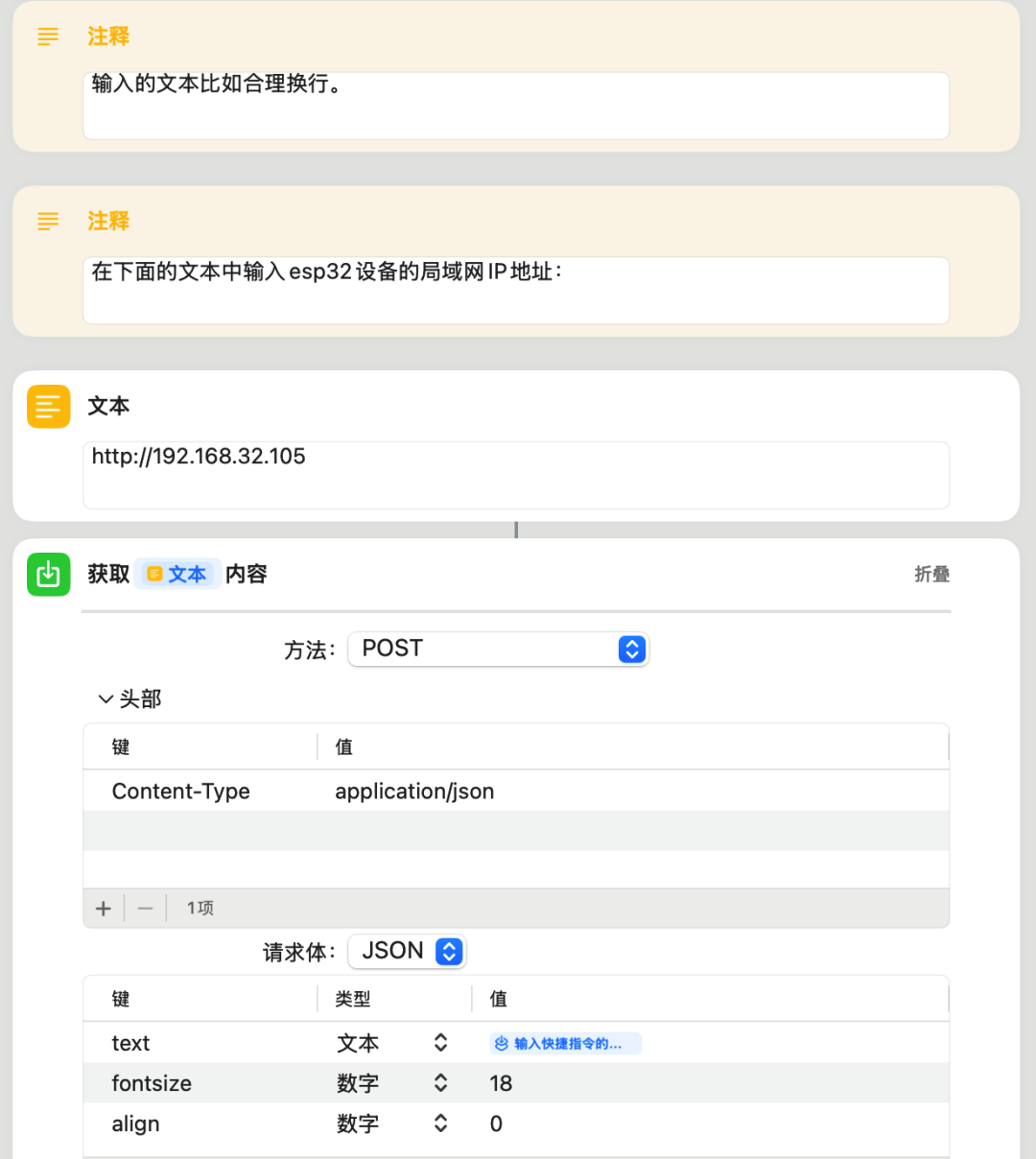 2、在iPhone上创建一个快捷指令,用于将传入快捷指令的信息,发送到esp32主控服务器上。