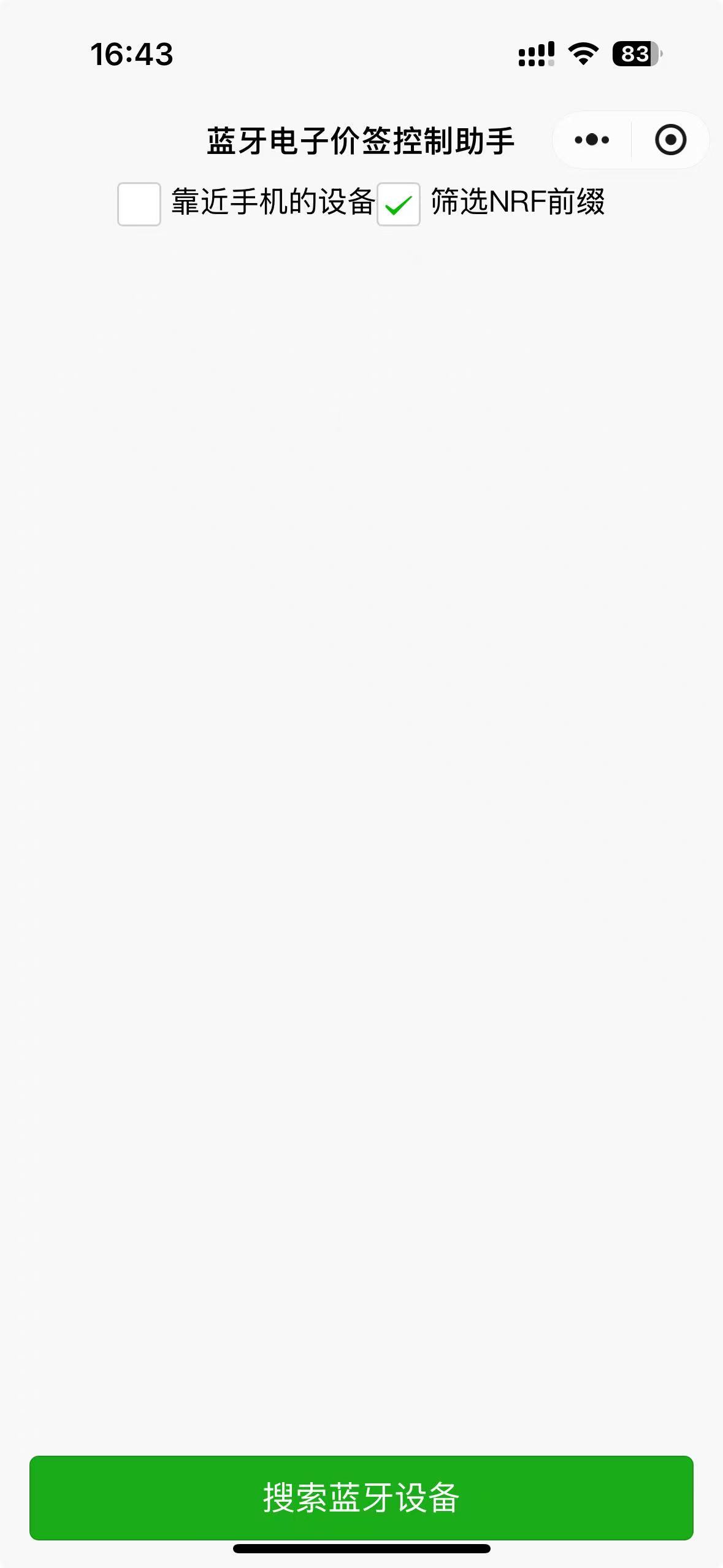 上面界面中,顶部的打勾按照默认即可,左边的不要打勾。点击底部的“搜索蓝牙设备”搜索,应该是“NRF-***”类型的编号。如果手机提示小程序需要蓝牙权限,请点击允许,否则没法搜索到日历设备。