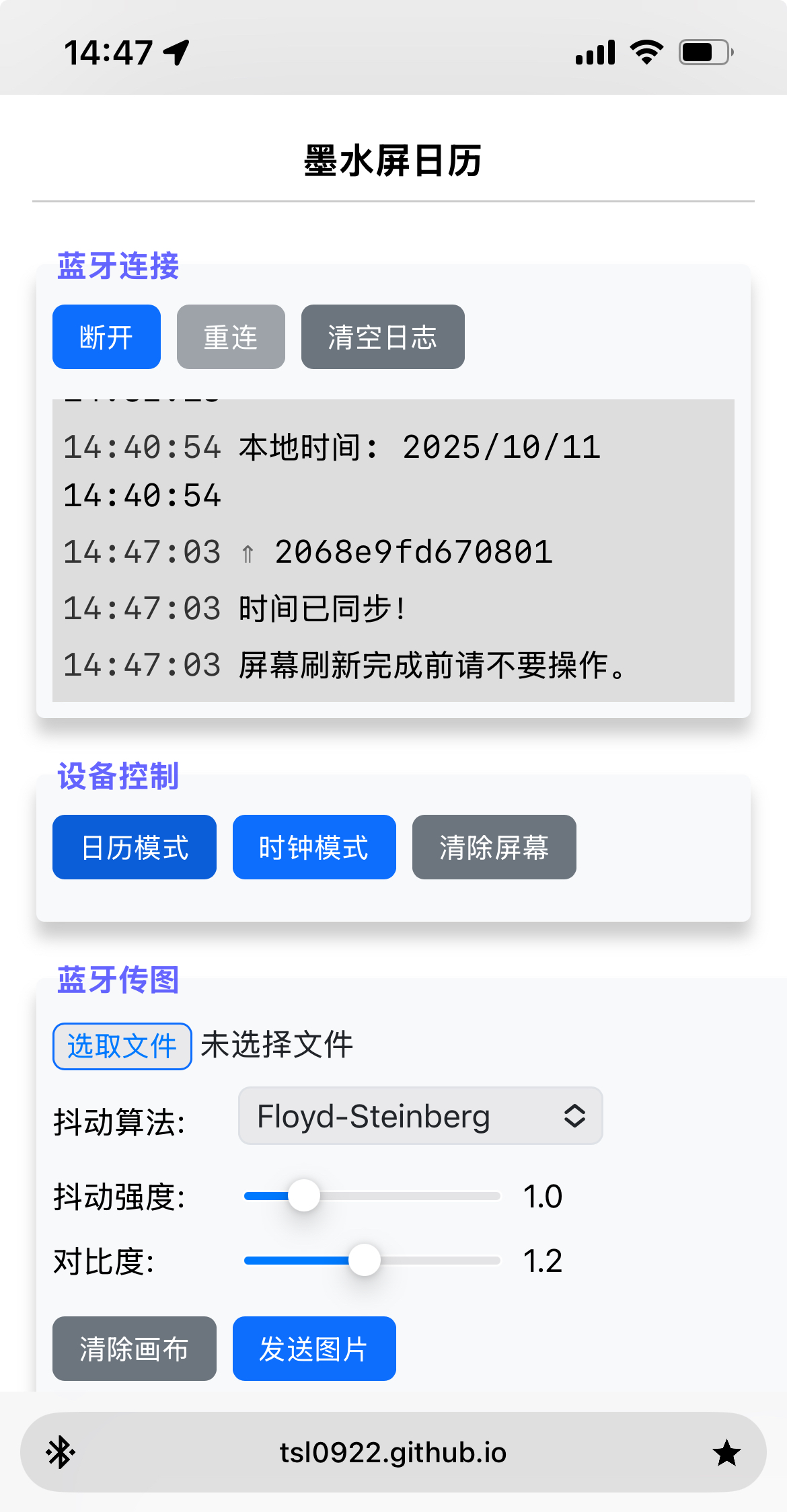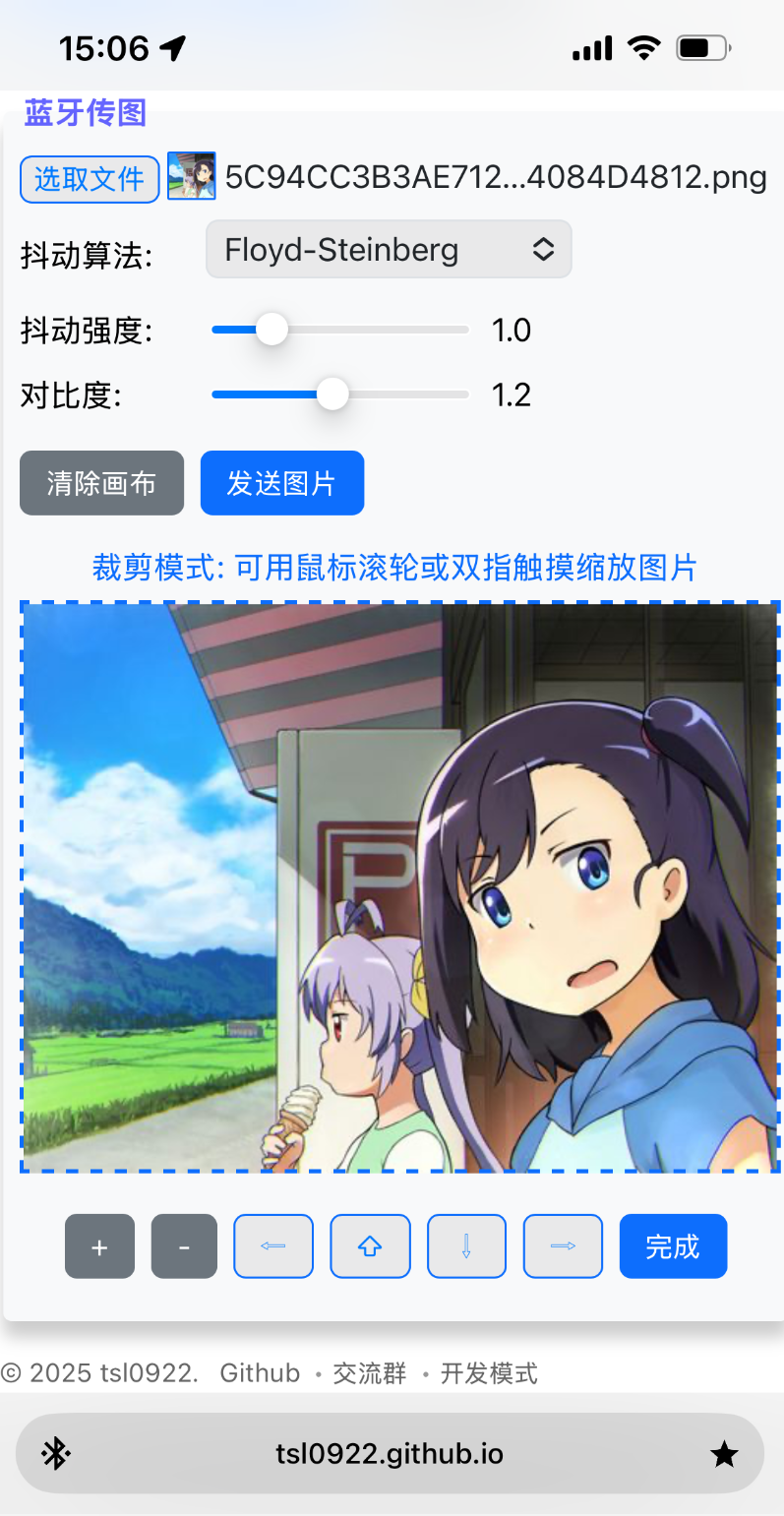 按需求调整“抖动算法”、“抖动强度”、“对比度”参数,效果满意后点击“发送图片”按钮,等待图片传输完成。正常传输耗时在 1-5s 左右,苹果手机快一些。
