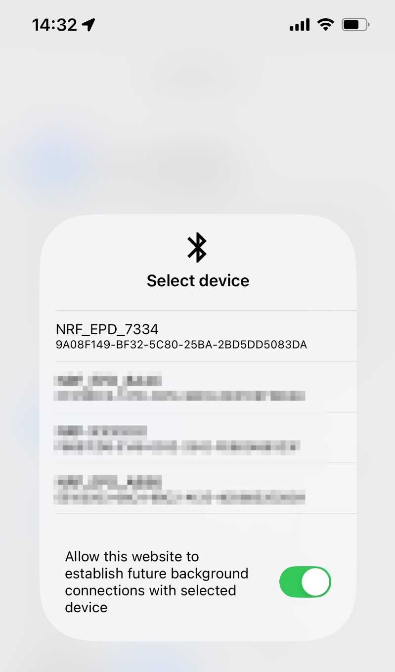 墨水屏蓝牙名称格式为 NRF_EPD_XXXX(后四位取自蓝牙 MAC 地址)。墨水屏界面上也会显示蓝牙名称(如下图所示):